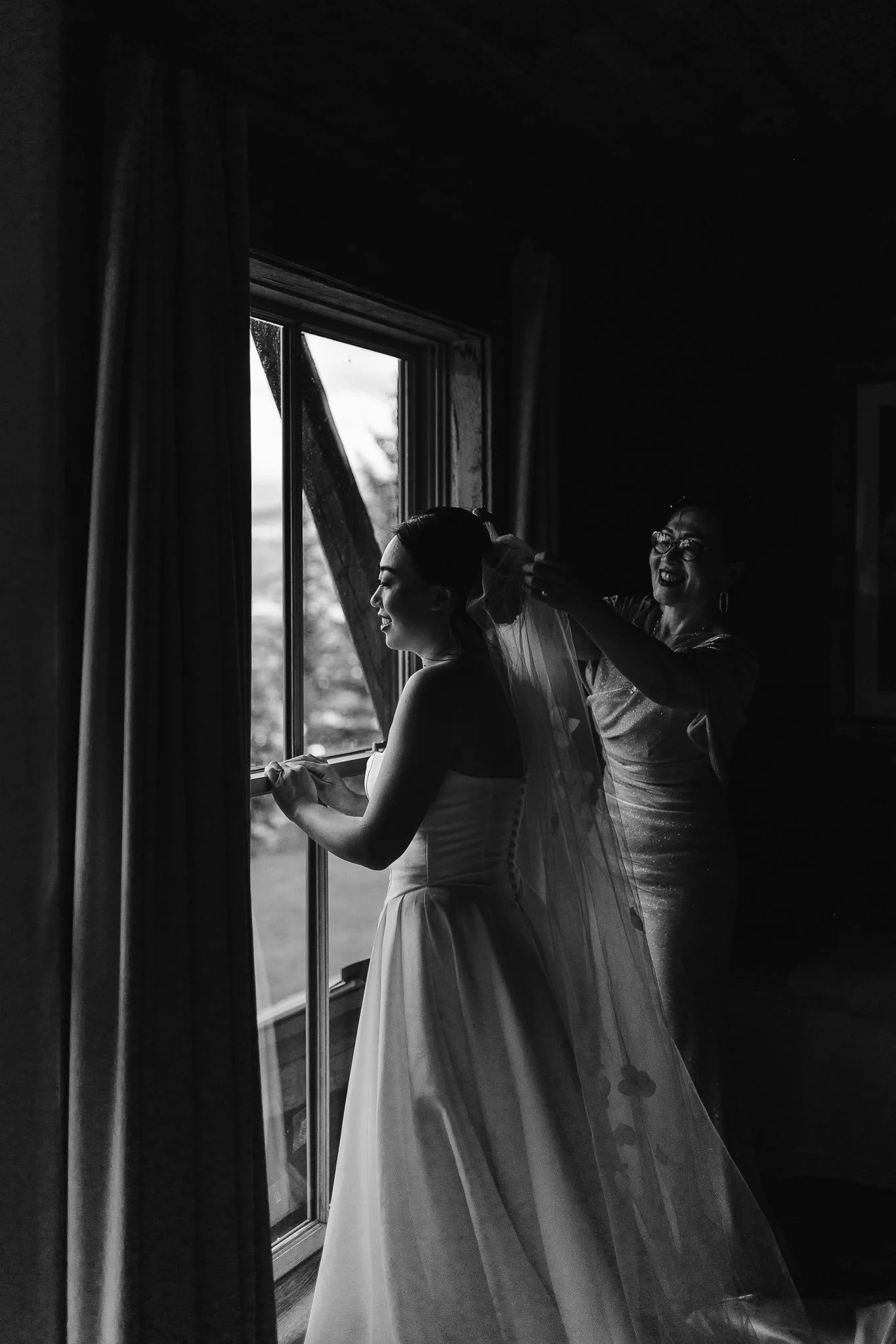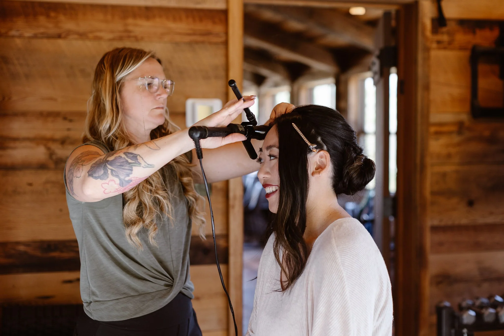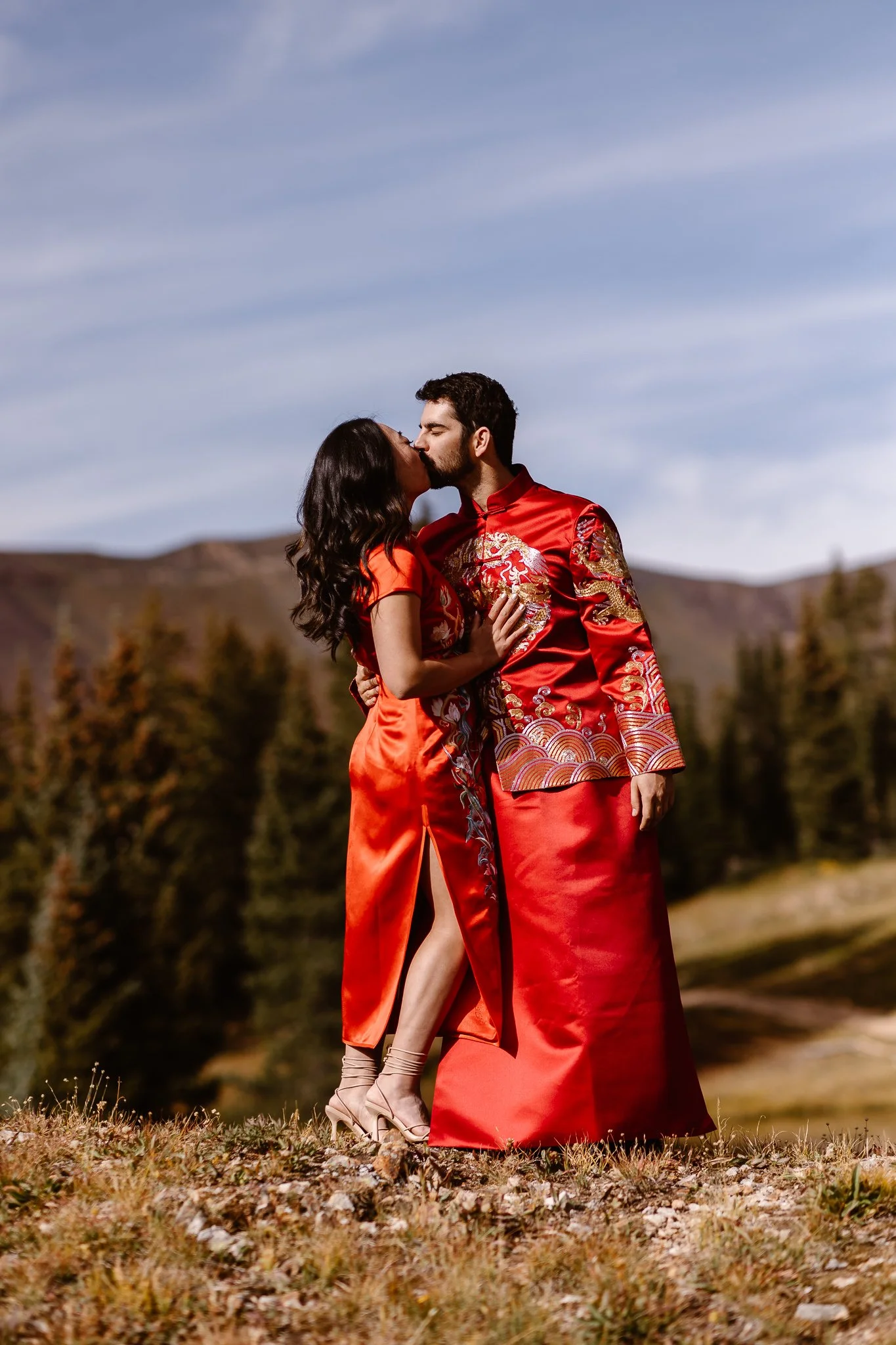 On Friday, R and D slipped away for an intimate morning of first looks, portraits, vows and champagne toasts (for which D performed an impressive ‘sabering’). The two radiated pure love and joy, which seemed to reflect off the alpine lake along which they playfully embraced and danced. A moose even graced us with its presence– maybe a harbinger for another creature that was to appear later! R and D changed into their traditional Chinese wedding attire at the top of a pass, before decamping for family and friends photographs at the house, featuring adorable Odie, and a dinner out in town.
