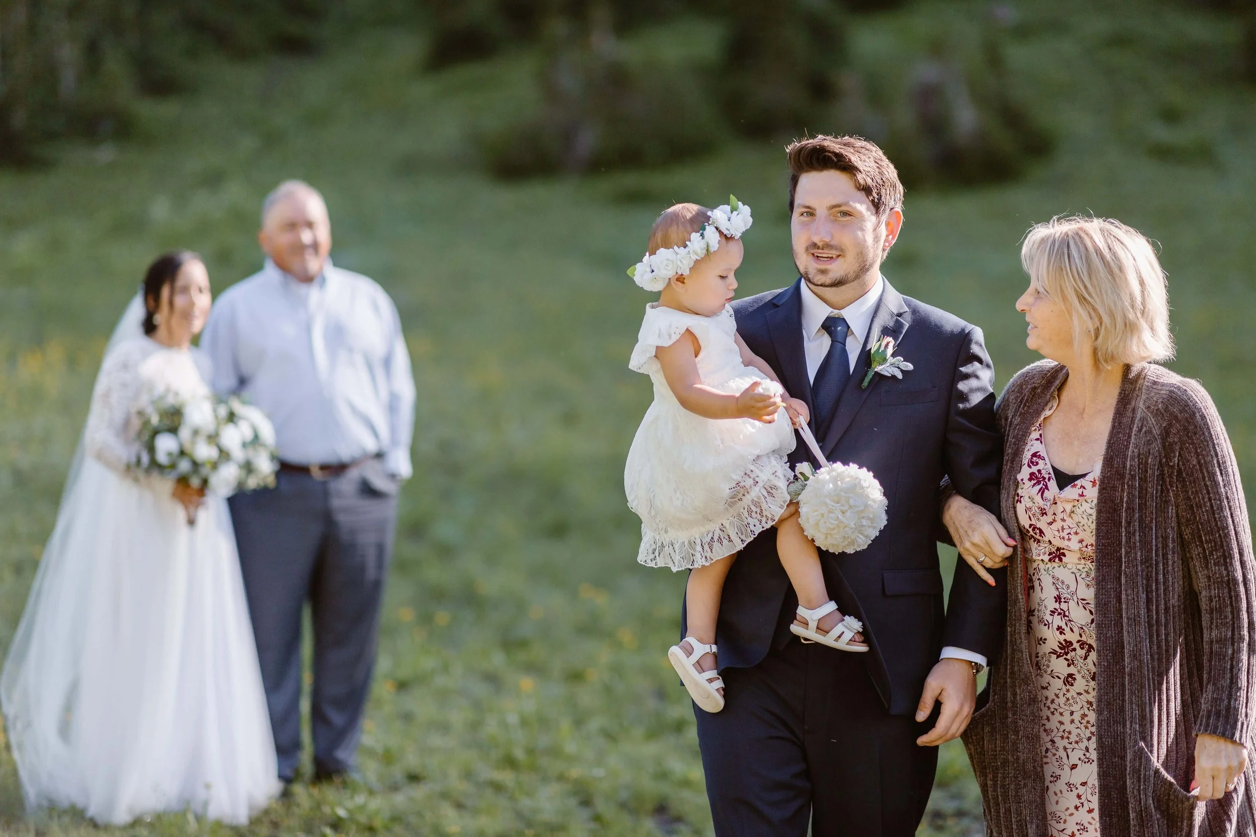 Osnaeley and Austin invited their family to the ceremony on a gorgeous mountain lake. The day turned out to be lovely and filled with sunshine and we took more portraits of them at the lakeside. Soon it was time to head back to the Airbnb with plans to meet later for their first dance, speeches, toasts, and cake cutting. The whole family was there and the father and daughter dance was wonderful. I recorded so many great memories of their sweet dance together.