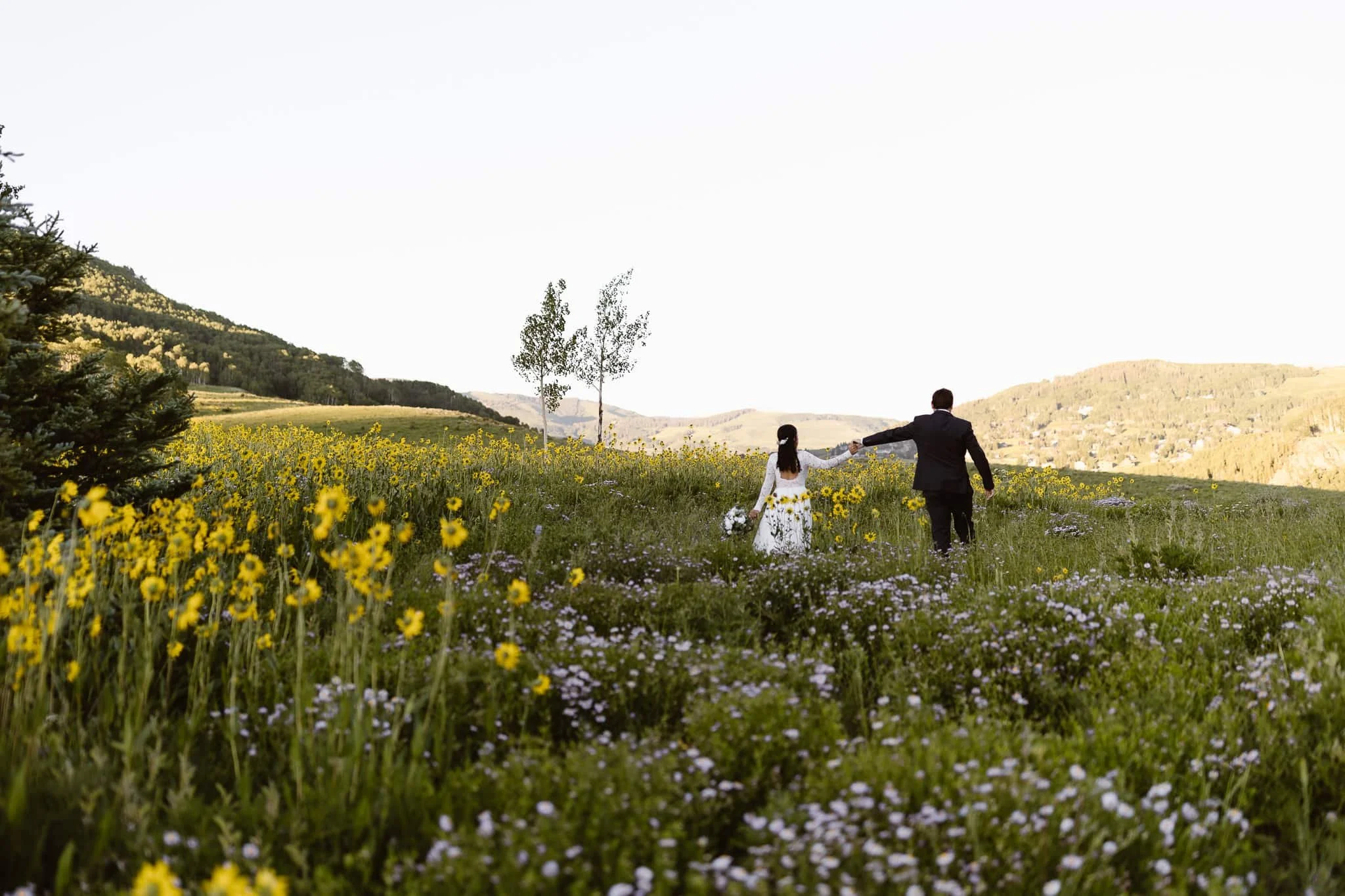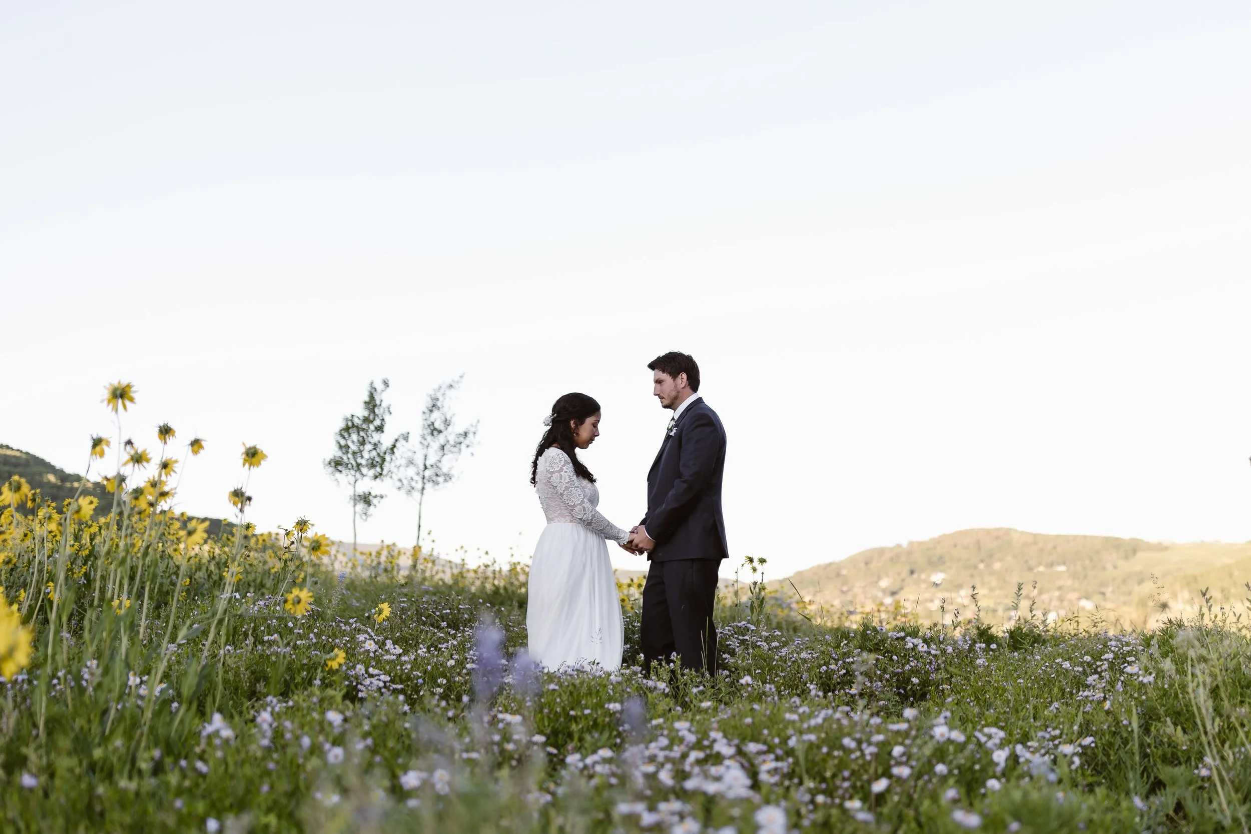 It was a bit chilly on the morning of July 7, 2021, when I met them at their Airbnb before the sunrise vow reading and First Look portraits. It had rained, but now everything was green with beautiful wildflowers peeking through—a typical summer day in Crested Butte.
